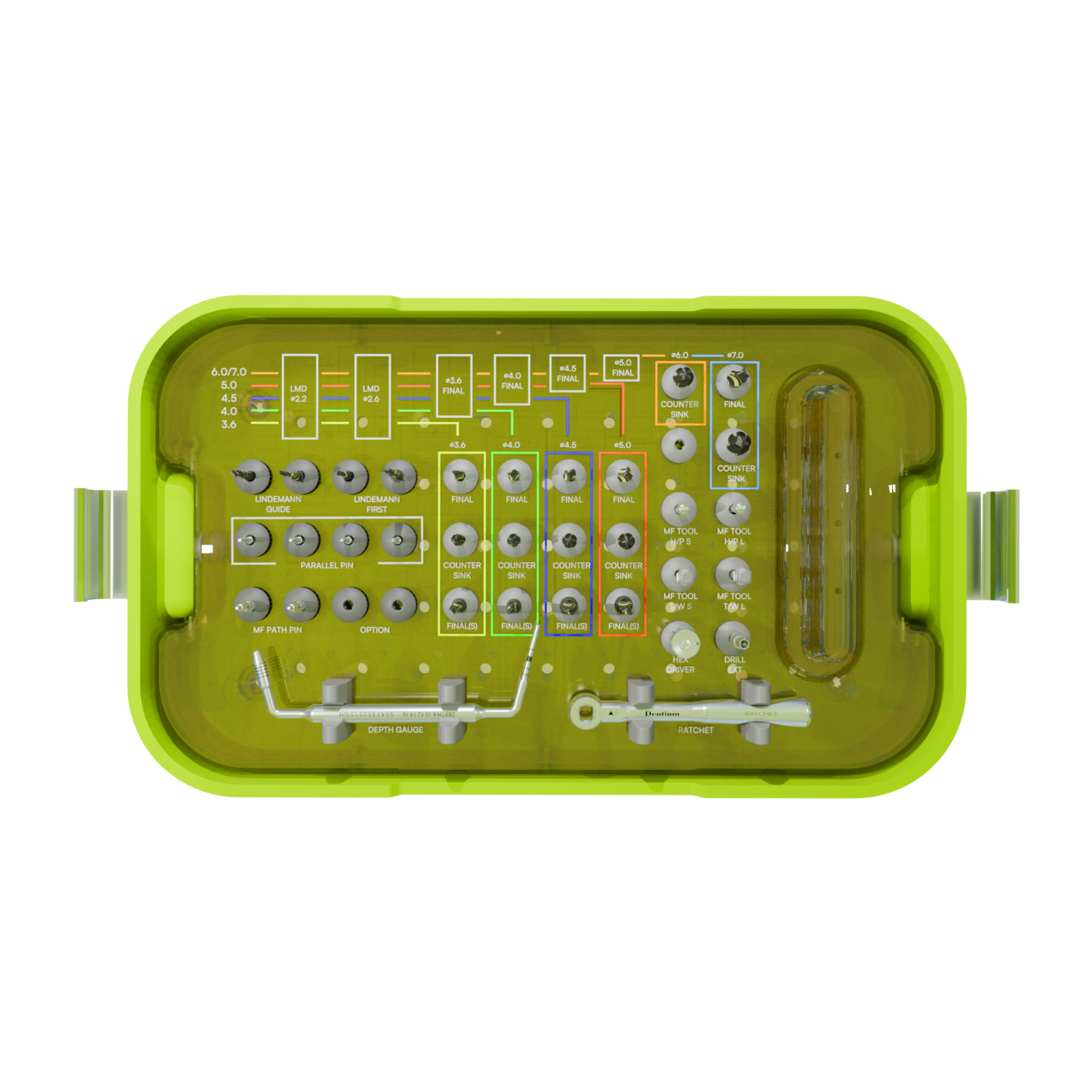 - This Surgical Kit is compatible throughout all Dentium SuperLine II, SuperLine and Implantium dental implant system. (For 7 mm implants, "Surgical Kit [Short Implant] must be used.)